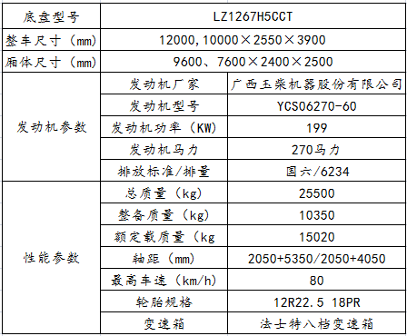 H5高頂駕駛室,軸距2050+5350/2050+4050,玉柴270馬力發(fā)動機(YCS06270-60),法士特八檔變速箱(8JS105TA),2*5.5T盤式前橋,后橋440/4.875/加寬制動器,板簧3/3/-,