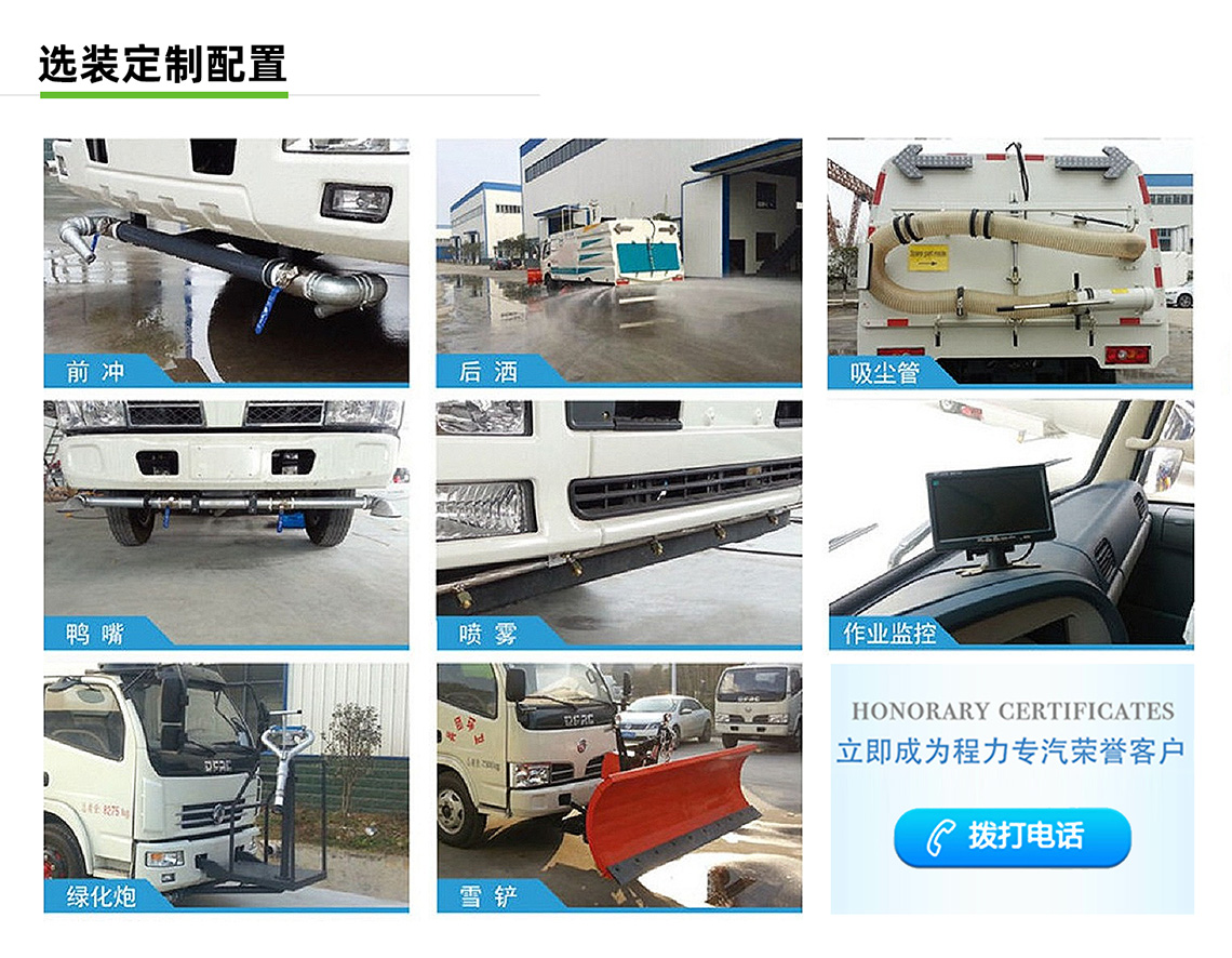 可加裝前沖、后灑、噴霧、自潔卷盤、作業(yè)監(jiān)控系統(tǒng)、輔助吸管裝置、推雪鏟等。