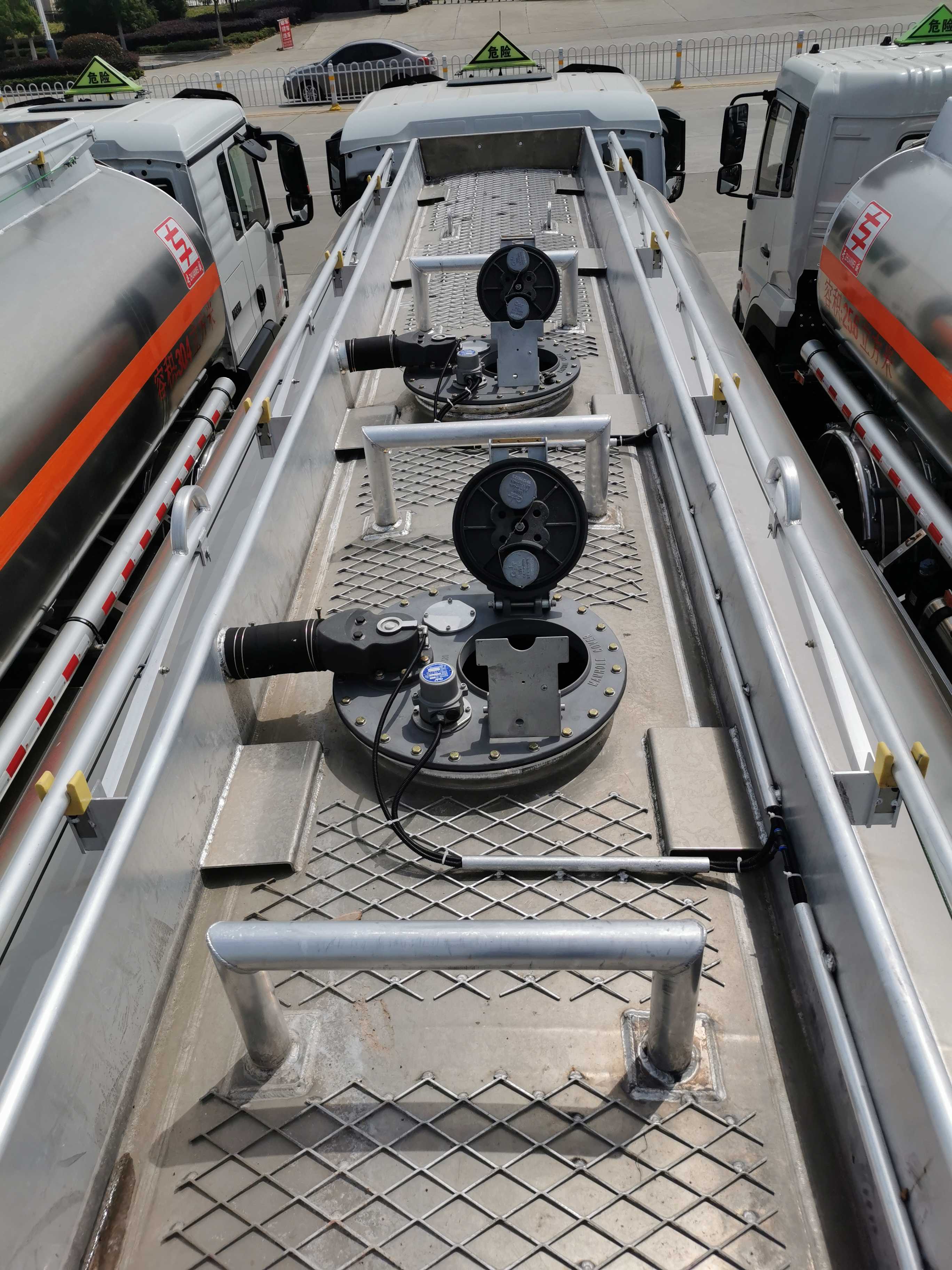 (帶鎖止功能),罐體頂部兩側帶折疊升降防護欄,標配鋁合金本色清漆,罐體兩側正中貼3M-1級橙色反光帶,貼三個“易燃液體”標識,安全告示