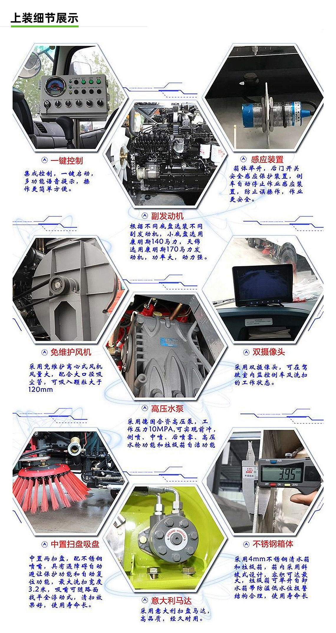 2:采用"中置兩立掃+中置寬吸嘴(內置高壓水噴桿)+左右高壓側噴桿"的結構。
