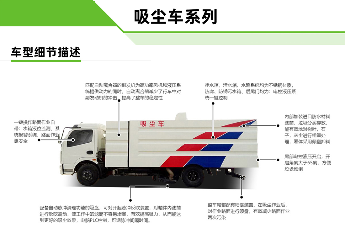 五十鈴10方吸塵車上裝配置:水箱3方,塵箱7立方,吸塵寬度3米,吸塵速度3-15公里每小時(shí),吸入顆粒110mm,駕駛室內(nèi)全電腦觸屏控制,灰塵過濾器,進(jìn)口脈沖除塵,車尾噴霧降塵裝置。 適合場(chǎng)合:適合于中小型廠區(qū)路面除塵作業(yè),無揚(yáng)塵,可達(dá)到環(huán)保要求。